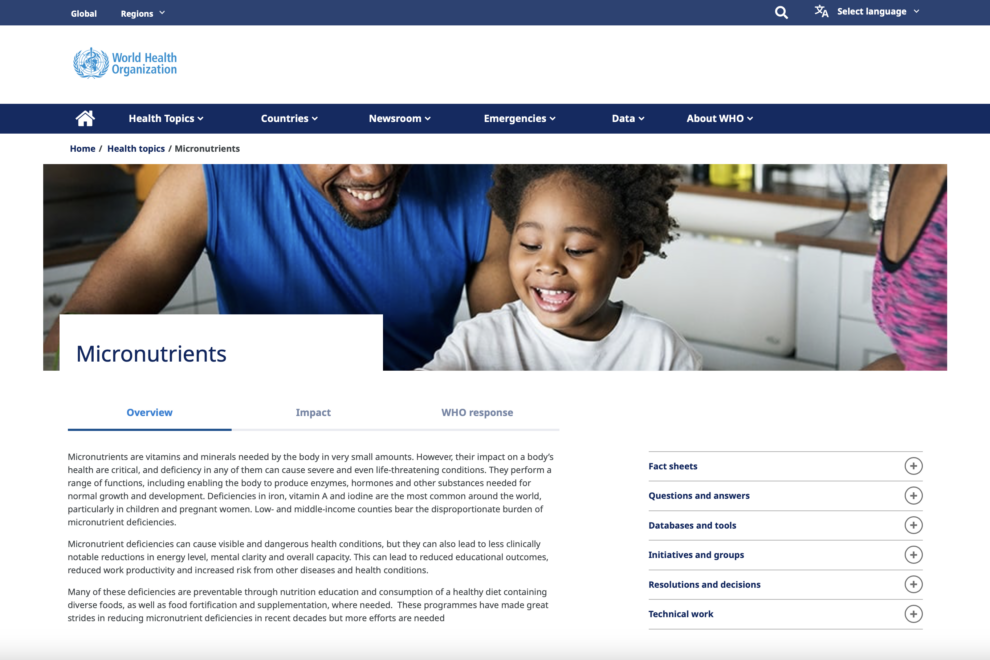 67 % aller Frauen im reproduktionsfähigen Alter weltweit und 50 % aller Vorschulkinder weisen eine Mangelversorgung an Mikronährstoffen auf, insbesondere Folat, Eisen, Vitamin A, Zink und Jodid.